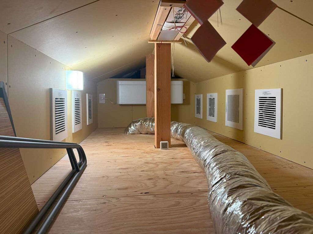 また、第一種換気システムとエアコンの配置関係が悪かったり、小屋裏空調室全体が負圧(建物全体の気圧よりも低くなってしまうこと)になってしまうと、小屋裏空調室からの送風量が極端に落ちます。よって空調用の送風ファンの能力に応じた小屋裏空調室への給気(RA)が非常に重要と言えます。