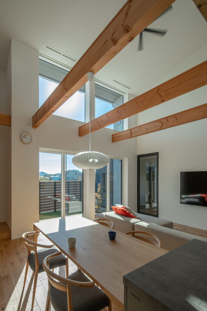 - 〇真南からの贅沢な採光: リビングは中庭を一体的に計画。太陽の光を最大限に享受するために、真南に向けて吹抜けの窓の壁を配置し、明るく健康的な空間を実現しました。
